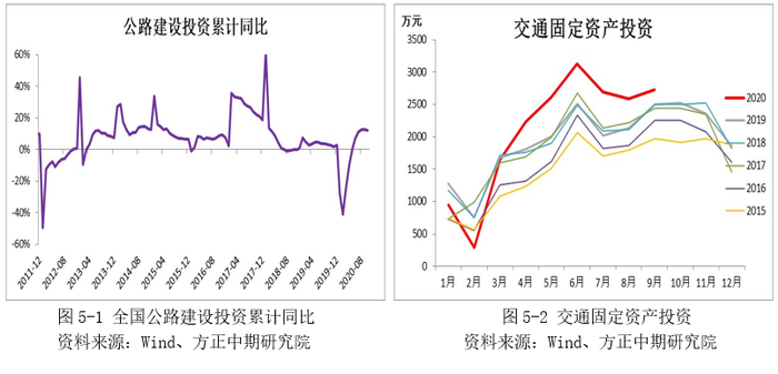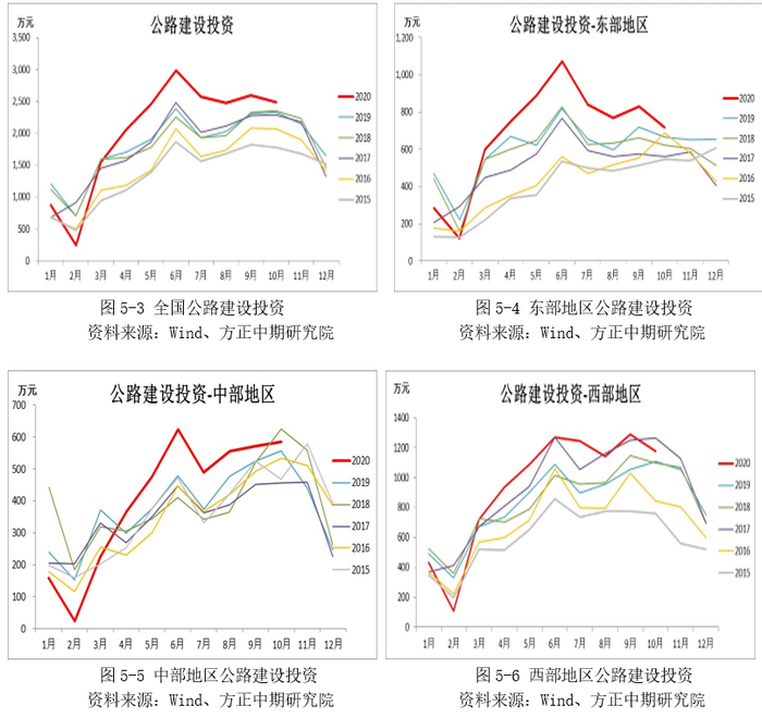 从公路建设投资角度看,受疫情和春节因素影响,2020年1-4月份国内公路建设投资累计同比呈现负增长,尤其是一季度同比下滑较为明显,而二季度以后公路建设投资步伐明显加快,1-10月份累计同比增长达到12%,其中,东部和西部地区公路建设投资增长幅度较高,1-10月份累计同比超过12%,中部地区累计同比在5%左右。
