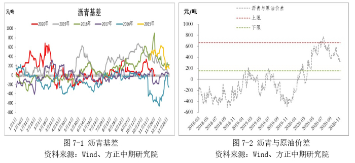 期现套利方面,2020年一季度由于沥青期价受油价大跌影响,期货盘面连续下挫,但沥青现货价格的下跌有些滞后,使得沥青基差大幅走阔,此后沥青期货跌势放缓,而现货价格连续下调令沥青基差回归。沥青期货价格与原油走势关联性较强,波动较为频繁,而现货价格的调整往往有些滞后,波动性低于期货盘面,通过我们的观察发现沥青基差的变化更多的是由原油波动引起的,往往表现为原油的涨跌引起沥青期货价格的迅速反应,但现货价格的调整滞后,并引起基差的波动。2021年建议把握原油价格大幅波动时带来的基差变动而产生的期现套利机会。