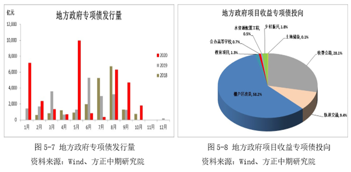 2020年,在国内经济受到疫情冲击的背景下,基建作为逆周期调整工具在持续发力,在此背景下,地方政府专项债发行量大幅提高以支持基建。2020年地方政府专项债发行额度将达到3.75万亿元,同比将增加1.6万亿元。上半年地方政府专项债发行进度明显加快,2020年5月份单月发行量高达9980亿元,创单月历史新高,但下半年稍有放缓,截至2020年10月底,新增专项债的发行金额达到3.55万亿元,已经超过全年计划发行总量的90%。从专项债投向来看,由于7-10月份棚改投向明显增加,导致收费公路占比下降,1-10月份有28%的项目收益专项债投向了收费公路,而在上半年达到60%以上。