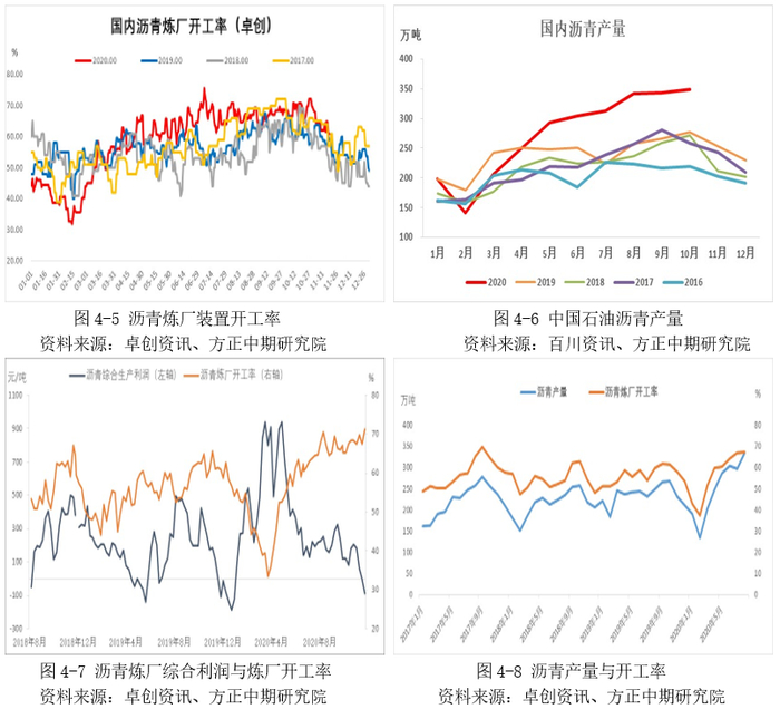 在需求以及高利润的驱动下,2020年2月份以后国内沥青炼厂开工负荷持续走高,根据卓创统计的资料,国内沥青炼厂开工率在2月份降至30%左右,创历史新低,此后持续回升,7月份以后开工率基本维持在70%左右,处于历史高位,11月份以后有所回落。