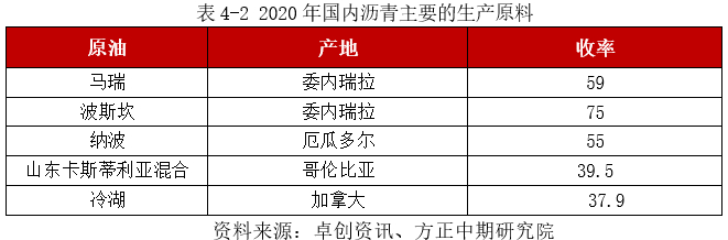 近几年,马瑞油产量的下降以及对国内供应的下滑令国内沥青行业一直担心沥青原料的供给,因马瑞油属于偏重质的原油,沥青出率高,2019年之前,马瑞油在国内沥青原料中的占比达到60%,但近两年持续下滑。2020年下半年委内瑞拉原油产量降至30万桶/日左右,而2016年以前产量在230万桶/日左右,2019年以来,马瑞油的到港量也在持续下降。