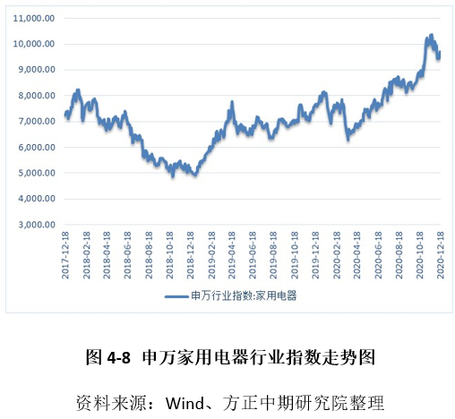 从家用电器行业指数的走势中,我们可以看出。在经历了2019年的震荡周期后,家电行业也在2020年复工复产开始时开启了持续全年的流畅上行。房地产行业的繁荣拉动了家电消费,另外在疫情影响下人们生活方式的转变也起到较大的促进作用。在地产行业持续繁荣的当下,家电制造势必也将继续跟随,预计2021年上半年,家电行业的消费需求还将呈现稳步增长的态势。
