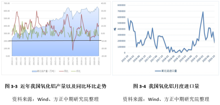 202年以来,氧化铝产能的持续投产以及进口氧化铝的不断增加,给氧化铝供给端带来较大的增量,虽然下游需求方面也在不断增加,但依然受制于供大于求的现状,行业维持产能过剩的境况。也是因为如此,氧化铝全年价格在经历了疫情之后的一大波拉涨后就很快回落,此后持续低位运行。就目前的供需平衡状态来看,未来如果产量增速不能有效的得到控制,那么2021年也是大概率维持着产能过剩的局面。