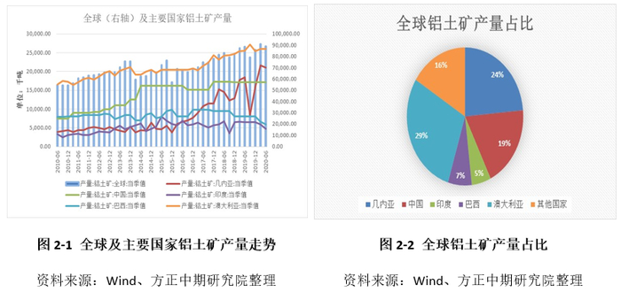根据世界金属统计局(WBMS)的数据来看,全球范围2020年铝土矿产量继续增长态势,但是由于疫情等原因,增速较2019年略有下滑。分国别看,铝土矿产量呈现此消彼长的态势,其中几内亚和澳大利亚都呈现较为明显的增长趋势,几内亚的增长幅度更为明显。而巴西以及印度产量都有所下滑,中国则是基本与去年持平。未来随着全球需求的进一步增加,铝土矿资源丰富的几内亚以及澳大利亚仍然是增量所在。尤其是几内亚,基础设施落后在一定程度上制约其产量释放,但其矿产品味高、生产成本低,始终是最受欢迎的铝土矿产地,未来必然会持续产出并且抢占市场份额。