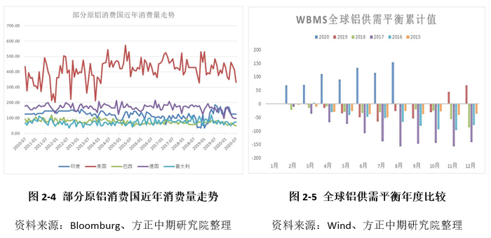 整体上看,全球原铝消费依然呈现小幅增长的局面。但是增量基本上是中国一家贡献,其他铝主要消费国受疫情影响都呈现消费量环比2019年减少的态势。在WBMS的全球铝供需平衡统计中,从2016到2019年以来,全球原铝整体供应依然处于短缺状态,但是进入2019年底2020年以后,原铝就开始转为过剩,并且幅度呈现震荡增加的趋势。