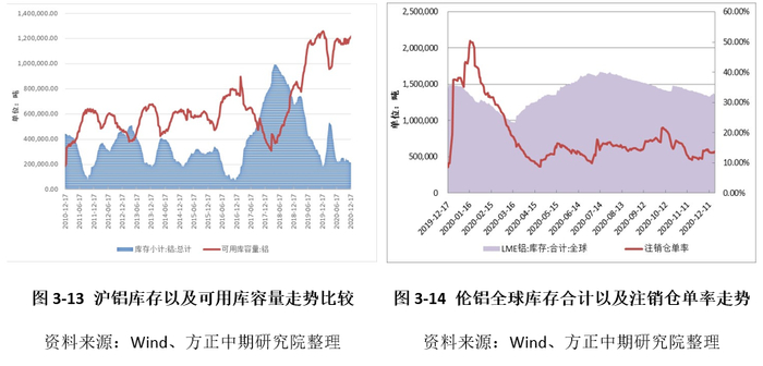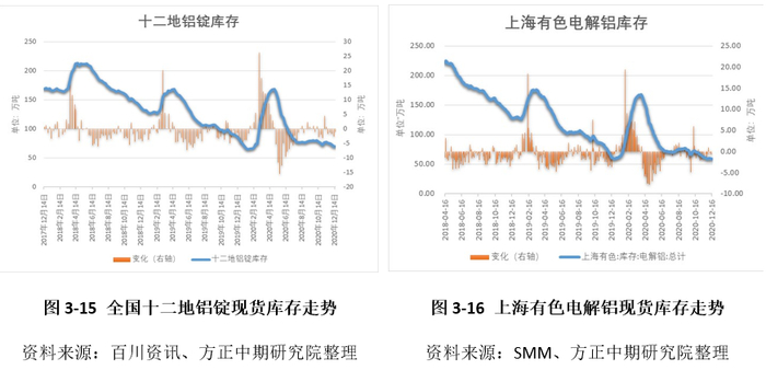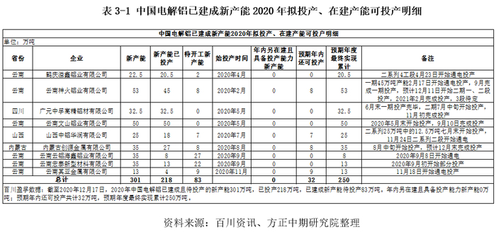 如果说供需是市场的晴雨表,那么铝锭库存状况就是沪铝价格的指南针。2020年全年的库存变化状况,可以分成三大阶段:年初的库存低位、春节后的迅速累库、以及四月开始的快速去库,对应沪铝盘面价格,完美引导了铝价的转折。可以说累库和去库周期的开始就是价格趋势性行情的开端。那么持续低位运行的库存能否在2021年春节前后出现季节性累库将决定明年铝价下跌的时间点。2020年以来新产能投产所带来的产能释放将决定铝价下跌的深度。