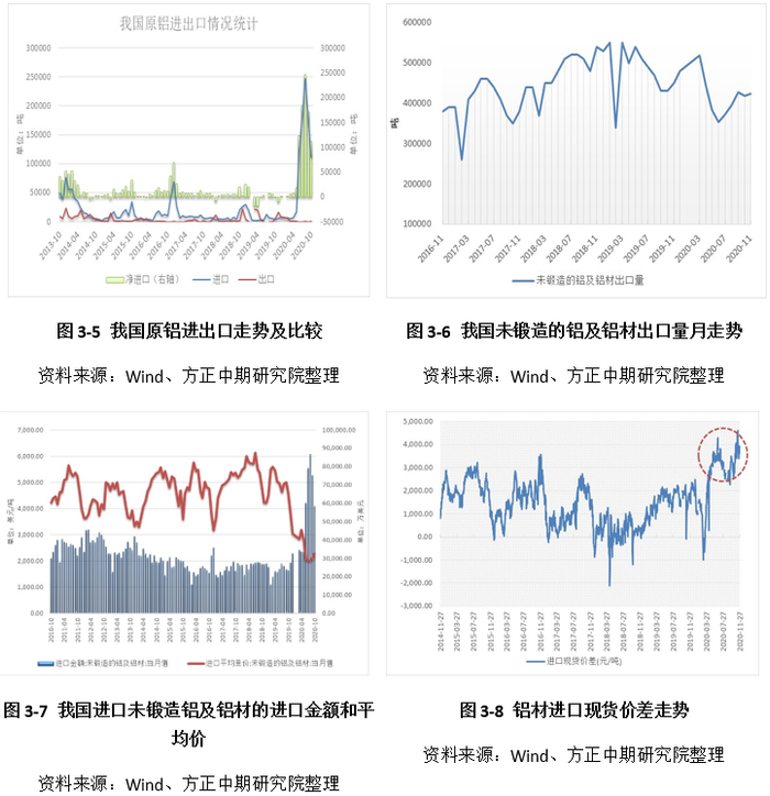 2020年二季度,国内铝价从底部反弹猛涨,伦铝价格依然在低位徘徊,内外价差不断拉大,进口窗口也逐渐打开。再加上疫情影响国外部分需求,铝锭进口量也就持续放大,开启了净进口的局面。到了三季度后期,随着伦铝价格的抬升,进口窗口才出现逐渐关闭的迹象。海关最新数据最显示,中国10月电解铝进口量11.15万吨,环比减少35%。2020年1-10月电解铝进口量累计86.7万吨。出口方面则受国外疫情反复的影响,全年都呈现出环比下滑的态势。各国对我国铝材行业的“双反”调查也是不利因素之一,整体上而言2020年绝对是出口大幅受阻的一年。数据显示,2020年11月中国未锻轧铝及铝材出口量为42.4万吨,环比2020年10月41.9万吨增加1.19%,同比减少6.19%;出口金额120130万美元,同比增加1.02%。2020年1-11月未锻轧铝及铝材累计出口量440.4万吨,同比减少16.1%;累计出口金额为1182700万美元,同比减少15.3%。随着疫苗的研制及上市,未来疫情的影响因素预计会逐步淡化,国外需求也将会在2021年出现明显回升,届时铝材出口预计也将呈现恢复性增长态势。