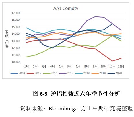 总体来看,沪铝价格走势季节性规律不强,这与其合约连续性有关。从近七年的价格变化规律中我们可以发现,二季度和三季度末是沪铝价格比较强势的时点。彼时原铝下游需求也正好是旺季来临,不论建筑用铝消费还是汽车用铝消费都是最好的季节。可以肯定的是,虽然季节性规律在近几年逐渐背淡化,出现旺季不旺、淡季不淡的行情,但是长期来看依然有跟随需求旺季价格上涨的趋势存在。
