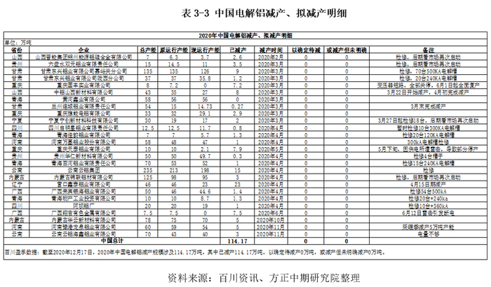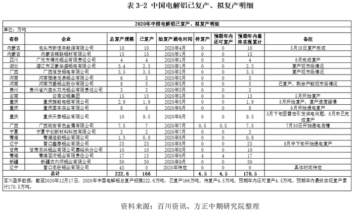 据百川资讯的统计,截至2020年12月17日,中国电解铝有效产能(以有生产能力的装置计算)4841.8万吨,开工3913.30万吨,开工率80.82%。截至2020年12月17日,2020年中国电解铝减产规模涉及114.17万吨,其中已减产114.17万吨,已确定待减产0万吨,或减产但未明确减产0万吨。截至2020年12月17日,2020年中国电解铝总复产规模222.6万吨,已复产166万吨,待复产4.5万吨,预期年内还可复产4.5万吨,预期年内最终实现复产累计170.5万吨。截至2020年12月17日,2020年中国电解铝已建成且待投产的新产能301万吨,已投产218万吨,已建成新产能待投产83吨,年内另在建且具备投产能力新产能0万吨;预期年内还可投产共计32万吨,预期年度最终实现累计250万吨。