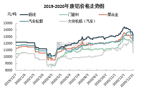 卓创预计2021年1月份废铝市场价格较12月价格震荡盘整运行为主。主要考虑到年底下游需求有所缩减,临近春节,市场交投氛围整体减弱,贸易商多观望为主。预计1月份铝亮线月均价格在14100左右,铝合金锭价格或震荡运行为主,价格运行空间在15600-16000元/吨。
