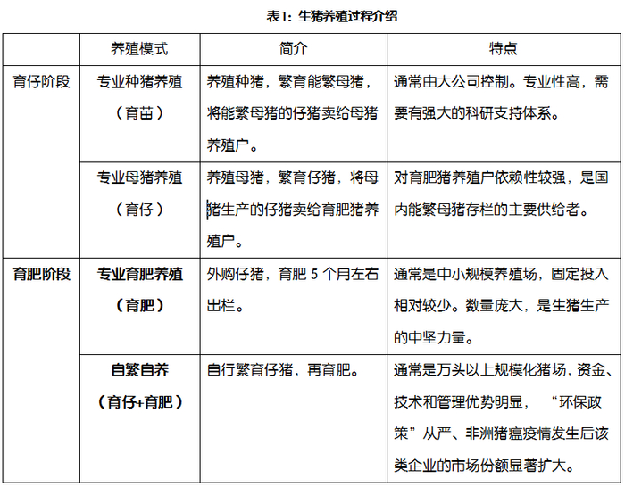 生猪养殖全过程主要分为三个阶段:育苗、育仔和育肥;其中,育苗阶段的养殖模式差异不明显,因为大规模的养殖企业通常自己控制祖代猪的种源,培育和繁殖优质父母代种猪;而育仔和育肥这两个阶段是区分养殖企业经营模式的主要判断依据。按照养殖阶段的分工不同,主要有专业育肥和自繁自养这两类养殖模式:专业育肥 投入较小、通常是中小规模养殖场,自繁自养投入较大、以中大型养殖企业为主。