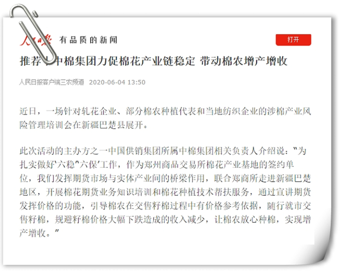 2020年6月,中棉集团在新疆巴楚县开展棉花期货业务知识培训和棉花种植技术帮扶活动,充分发挥“产业基地”功能,在扎实落实“六稳”“六保”工作基础上,把金融助农落到了实处。
