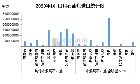2020年10-11月份石油焦进口量为119.10万吨,其中硫含量小于3%的未煅烧焦石油焦46.6万吨,其他未煅烧石油焦75.5万吨。从地区来看,硫含量小于3%的未煅烧焦石油焦主要进口自美国、哥伦比亚、智利、罗马尼亚等地,其中进口自美国25.89万吨,占比最大。其他未煅烧石油焦主要进口自沙特阿拉伯、加拿大、美国及中国台湾等地。2020年10-11月份石油焦进口量较2019年10-11月份进口量减少29.43万吨,主要受国内外经济环境及公共卫生事件等因素的影响。