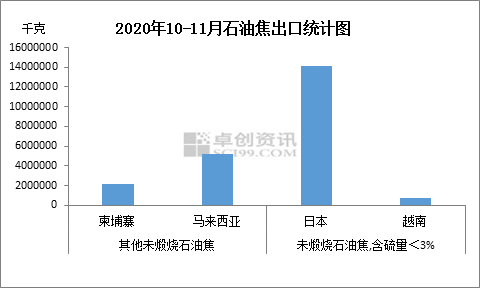 2020年10-11月份石油焦出口量为2.22万吨,其中硫含量小于3%的未煅烧焦石油焦为1.48万吨,其他未煅烧石油焦为0.74万吨。从地区来看,硫含量小于3%的未煅烧焦石油焦主要出口地为日本,其他未煅烧石油焦主要出口地为马来西亚及柬埔寨。受国内石油焦资源紧张影响,10-11月份石油焦出口量较2019年10-11月份减少3.18万吨。