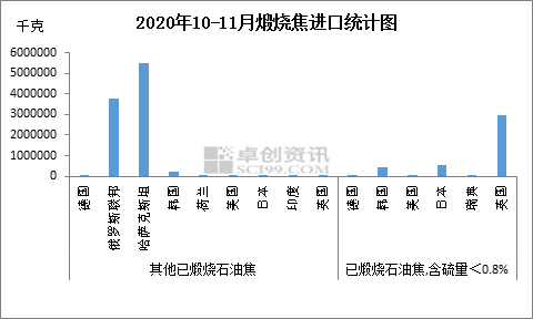 2020年10-11月份煅烧焦进口量为1.35万吨,其中硫含量小于0.8%的已煅烧石油焦0.4万吨,其他已煅烧石油焦0.95万吨,从地区来看,硫含量小于0.8%的已煅烧石油焦主要进口自英国,其他已煅烧石油焦主要集中在哈萨克斯坦及俄罗斯联邦两地。