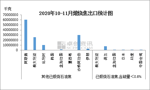 2020年10-11月份煅烧焦出口量为15.06万吨,其中硫含量小于0.8%的已煅烧石油焦为1.8万吨,其他已煅烧石油焦为13.26万吨。从地区来看,硫含量小于0.8%的已煅烧石油焦主要出口荷兰地区,其他已煅烧石油焦出口主要集中在阿联酋、沙特阿拉伯及澳大利亚等地。