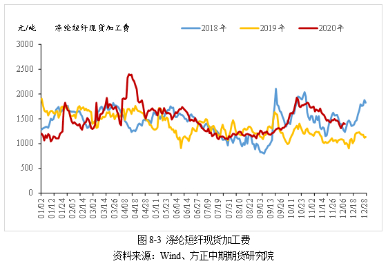 2020年,涤纶短纤生产效益改善。1~11月份,涤纶短纤现货日均加工费为1484元/吨,较去年同期增加了98元/吨。从生产效益来看,涤纶短纤现货加工费一直处于900元/吨的保本加工费水平之上,全年均处于盈利状态。但由于下游低价抄底量较多,高价接盘量较少,因此全年实际效益会略低于理论估算值。