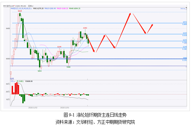 2021年,基于对原料价格中枢抬升的预期,叠加短纤自身供需面良好,预计短纤期价运行区间为6000-7200元/吨。从绝对价格走势来看,短纤价格走势整体跟随原料PTA和乙二醇,2021年一季度PTA和乙二醇均有较大的累库压力,届时短纤或跟随回调。但一季度末、二季度,终端订单将逐步增加,产业链自下而上驱动,短纤价格或偏强运行。操作上回调至40日均线附近或6000一线可考虑介入多单。