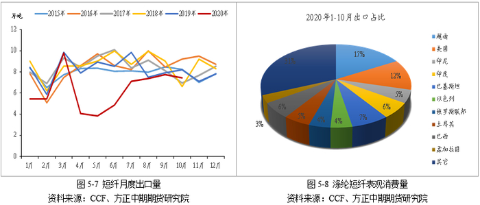表观消费量逐步走高。2020年1~10月份,涤纶短纤表观消费需求为528.26万吨,较去年同期增加了68.26万吨,增速为14.8%。表观消费量的增加主要是因为短纤产量提升明显,差异化产品需求较好,同时短纤期货上市,大量期现商涌入市场,需求的“蓄水池”扩容明显。2021年,随着国内差异化产品的投产,以及终端需求的逐步修复,预计短纤表观消费量将进一步走高。