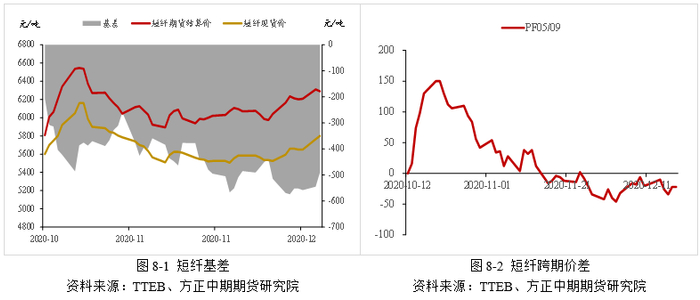 从期现价差来看,2020年12月中上旬,基差在-600~-500元/吨之间波动,处于偏低水平。2021年,涤纶短纤供需面整体健康,作为靠近下游的品种,短纤现货价格上涨需要下游纱厂的跟进,明年春节过后,随着终端需求跟进,短纤基差或迎来阶段性修复。