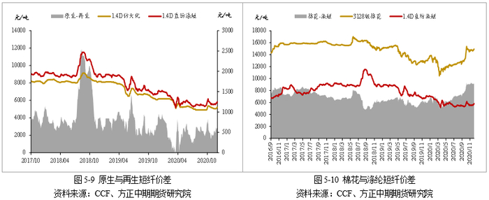 从需求端来看,终端修复预期下,需求增速乐观。2021年,预计全球经济将逐步复苏,终端纺织服装行业需求有望修复走强,短纤内需和外需均有望改善。此外,原生短纤对再生短纤仍有替代空间,竞品棉花价格有望持续走高,或提振短纤需求。