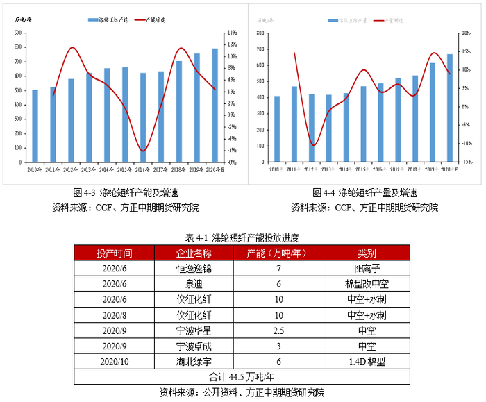 2020年,行业新增38.5万吨/年的涤纶短纤产能,涤纶短纤产能基数达792万吨/年,产能增速为4.4%。其中,泉迪6万吨/年的产能为棉型改中空,故不算入新增产能。从新增产能投放类型来看,多以中空、水刺等差别化产品为主,而期货标准品1.4D棉型短纤新投产能仅有湖北绿宇一家投产,产能为6万吨/年。