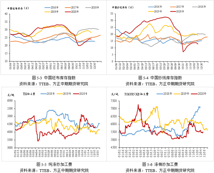 2020年,坯布纱线库存先增后降。2020年,受疫情的冲击,起初人们出行受限,社交需求降低;随后经济增速下滑抑制了人们对纺织服装消费的支出。因此,尽管4~7月份,国内疫情逐步好转,织造企业顺利恢复开工,但消费端复苏水平依旧缓慢,纺织服装行业内需和外需受损均非常严重,期间坯布和纱线库存不断累积。根据TTEB数据显示,2020年内中国坯布库存指数高点为33.1天,中国纱线库存指数高点为32.5天。8~10月份,国内电商节和年末冬装备货,加之海外出口亦有补仓需求,坯布和纱线库存高位回落,10月初两者库存水平已低于去年同期水平。11月份开始,随着“双十一”购物节的结束,终端补货告一段落,但织机负荷仍较高,因此坯布和纱线库存开始回升,但仍旧明显低于2019年同期水平。