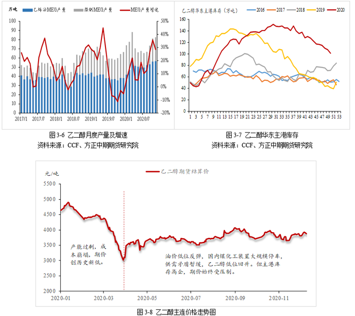 展望2021年,乙二醇正处于产能扩张周期,成本推动价格中枢抬升。从成本端来看,原油、煤价重心有望抬升。受疫苗研制乐观预期的支撑,2021年全球经济有望持续复苏,加之OPEC+减产托底,原油价格中枢有望进一步上移,对油制乙二醇成本支撑明显。煤炭方面,动力煤供需紧张局面难以缓解,价格亦将偏强运行,部分煤化工装置成本线亦将抬升。从供应端来看,乙二醇供需过剩局面难改。2021年,国内乙二醇行业计划新增产能为953万吨/年,尽管可能存在部分装置推迟投产,但整体供应压力依旧很大。进口方面,海外货源价格优势明显,进口量同比预计会有所下降,但体量依旧处于高位。从需求端来看,下游聚酯计划新增635.5万吨/年的产能,预计新增需求212万吨/年。因此,从供需面来看,乙二醇供需错配程度较大,高库存压力难缓解。由于多数石油制乙二醇为炼化一体化装置,企业往往会考虑综合效益,因为乙二醇环节的亏损停车或降负的难度较大,因此国内乙二醇供应的缩量仍将由煤制乙二醇给予,煤化工装置的仍将长期沿亏损线附近运行。考虑到煤价中枢提升,对应乙二醇价格重心亦将有所上移,但供需面始终压制乙二醇价格走强空间。