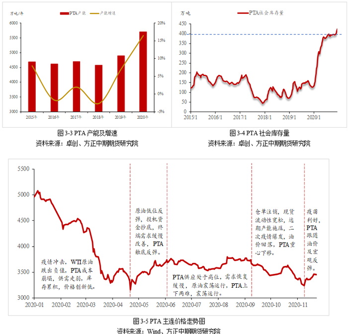 综上,2021年PTA供需面压力不改,但成本端支撑将增强,PTA期货价格中枢有望低位抬升,整体运行区间或在3400-4400之间。期价的上涨空间和动能将由原油价格上涨以及PTA开工率下降给出;期价的下跌空间和动能将来自于原油价格下跌和PTA供需面矛盾深化。