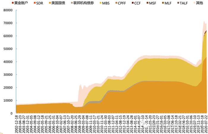 在理论上,美联储对基础货币的投放有三个渠道:购入美国政府债券、再贴现贷款(RP&TAC)和持有的黄金及特别提款权。