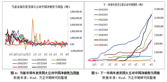 美豆出口方面,2020/21年度美豆出口节奏及累计出口量为历年最高水平,出口需求依旧强劲,近两周美豆对中国的出口节奏再度加快,同时,虽然美国新季度大豆还未播种,但中国在过去几天已开始采购2021/22年度美豆,出口数据对美豆市场价格仍有支撑。截至1月7日的一周,中国(大陆地区买家)净买入76万吨2020/21年度美国大豆,以及6.6万吨2021/22年度大豆,作为对比,前一周净买入37万吨美国大豆。此外,目前美国大选结果已定,短期内中国将继续履行第一阶段贸易协议采购内容,整体对豆类市场的影响主要通过美元汇率的波动及市场情绪影响。