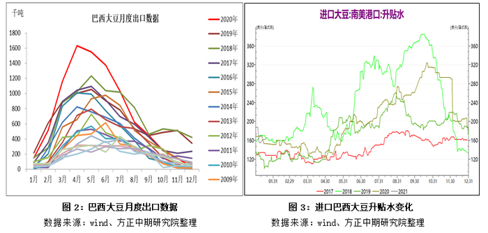 因2020年9月和10月份的干燥天气,造成巴西大豆种植推迟且拖缓了作物生长,截至1月18日,巴西大豆收获率仅0.4%,去年同期为1.8%。当前巴西最大的大豆主产州马托格罗索州的种植户已经开始收割早播大豆作物,但收获将比往年正常时间推迟15-20天,新年度巴西大豆收获预计集中在2月中旬至3月初。从巴西大豆产量预估来看,多家机构预测2020/21年度巴西大豆产量在1.31-1.34亿吨之间,巴西大豆丰产预期基本确定,但收割进度延后也将令全球大豆市场供应压力后移,巴西经济部数据显示,因干旱天气致使2020/21年度收割开局缓慢导致可用于出口的大豆量低影响,巴西1月前两周大豆日均出口量同比下降97%至1750吨。