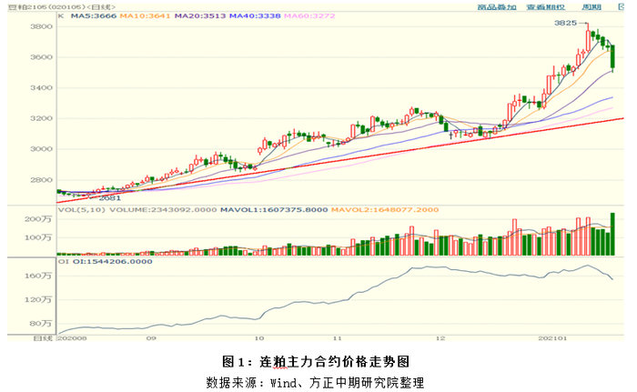 1月份USDA供需报告中下调美豆单产,同时上调美豆出口、美豆压榨数据,促使美豆期末库存大幅下调至1.4亿蒲,库存消费比达到3.1%的近七年最低水平,市场表现利多兑现,美豆价格一度大幅拉涨站上1400美分/蒲,目前国际大豆市场采购主体为美国大豆,不断下调的美豆期末库存及强劲的出口需求将长期支撑美豆市场价格,未来关注焦点仍在美豆出口节奏以及南美产量预期上,目前看拉尼娜气候现象在1月末至3月初造成阿根廷大豆产量减损风险仍存,后期持续关注南美天气对大豆产量的影响。