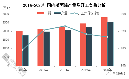得益于国内聚丙烯产能的持续性扩张,以及整体稳定偏高的开工负荷率,2020年国内聚丙烯产量依旧保持增长态势。据卓创数据统计,2020年国内聚丙烯产量在2554.44万吨,较2019年增长14.30%,国内聚丙烯全年开工负荷率在90.71%,较2019年小幅下滑0.66个百分点。2020年是一个装置扩能大年,第一、三季度的两番集中投产使得国内聚丙烯总产量也有了不小的增长,但因第三、四季度投产的装置仍需要一段时间的磨合才可进入稳定生产状态,加之因公共卫生安全事件等因素使得2020年检修损失量略多于预期,导致2020年国内聚丙烯开工负荷率出现小幅下滑,但整体依然保持着90%以上的开工负荷率。