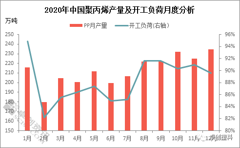 2020年中国聚丙烯产能扩能持续推进,今年国内聚丙烯产能达2816万吨,较2019年增长15.13%。国内聚丙烯产量在2554.44万吨,较2019年增长14.30%,国内聚丙烯全年开工负荷率在90.71%,较2019年小幅下滑0.66个百分点。