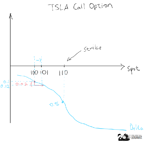 这新增的两万股便是本文的核心知识点Gamma效应。当股价从$101上升至102,103….以此类推交易员手里期权的delta不断变大(即做空特斯股票的数量越来越多),直到上升至1(一个期权的最大delta为1)。这意味着该交易员特斯拉股票的对冲仓位由最初的10万股,会一路随着股票价格上涨最多加仓到100万股。