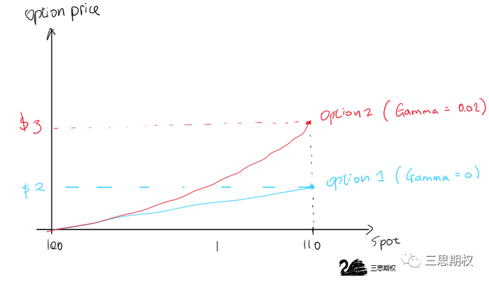 在上面的例子里,期权2越来越大的delta会带来什么不同呢?它意味着期权2的价格的变化的幅度也在增大。股价上升至$110,期权2的价格上升的幅度就要远大于期权1。