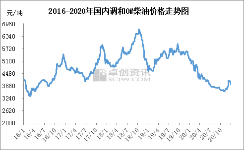 2016-2020年中国调和0#柴油价格先呈波浪式上涨,后呈小涨后持续回落走势。据统计,2020年调和0#柴油最高价为5215元/吨,最低价为3595元/吨,高低价差为1620元/吨;均价为4142元/吨,同比下跌22.48%。2020年因东部油品市场竞争加剧,中国调和柴油线有进一步西移趋势,因此中国调和柴油企业数量呈现出东部逐渐减少,西部逐渐增加态势。行情方面,2020年一、二季度因受全球爆发的新型冠状病毒肺炎及国际油品市场低迷影响,调和厂家出货持续清淡,调和0#柴油价格呈持续下滑走势。三季度,进入柴油需求淡季,厂家出货更显一般,调和柴油价格进一步回撤;三季度末至10月份,中国油市虽未出现“金九银十”,但在刚需支撑下,厂家出货较平稳,此阶段调和柴油价格虽仍稳中下跌,但跌势放缓。四季度中后期,原油呈偏强走势,受此带动,国内调和柴油价格稳中上行,但因部分地区调和0#柴油价格高于地炼柴油价格,中下游积极采购炼厂柴油,致使调和柴油出货持续一般。