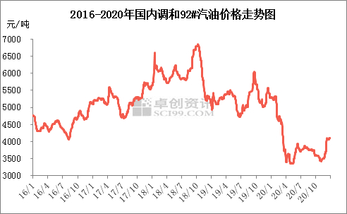 2016-2020年中国调和汽油价格呈宽幅震荡走势,其中最高值6800元/吨出现在18年10月中旬,最低值3358元/吨出现在20年5月中旬。据卓创资讯统计,2020年调和92#汽油均价为3933元/吨,同比下跌25.14%。2020年随着中国对环境污染、成品油税收的加大治理,及全球爆发的新型病毒肺炎疫情的影响,中国调和汽油产业继续退市,也更具隐匿性。2020年一季度受新型冠状病毒肺炎影响,中国市场对汽油需求大幅减少,各地调和汽油厂家出货清淡,调和92#汽油价格呈持续下滑走势。二季度国际疫情逐渐加重,原油需求骤减,原油价格迅速下滑,中国零售限价多次因触及“地板价”不作调整。国内外汽油市场环境一般,调和92#汽油价格持续低位运行,厂家出货一般。三季度原油期货价格回涨后维持震荡走势,中国汽油需求出现回升,但因受供过于求影响,厂家出货较平淡,调和92#汽油价格呈横盘整理态势。四季度,受部分原料价格高位支撑影响,国内调和92#汽油价格呈先小幅下跌后震荡上涨走势。然因终端需求一般,调和单位出货较平淡。
