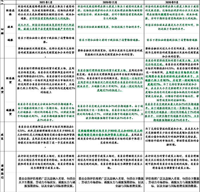 经济风险表述方面发生变化:本次议息会议强调,这场仍在肆虐的公共卫生危机将继续压制经济活动、就业和通胀,并对经济前景构成相当大的风险,这是不同于12月份“这场仍在肆虐的公共卫生危机将在短期内继续影响经济活动、就业和通胀,并对中期经济前景构成相当大的风险”的表述的,美联储强调疫情对经济构成风险,不论是短期还是中期,表明美联储官员不知道这种不确定性将持续多久。