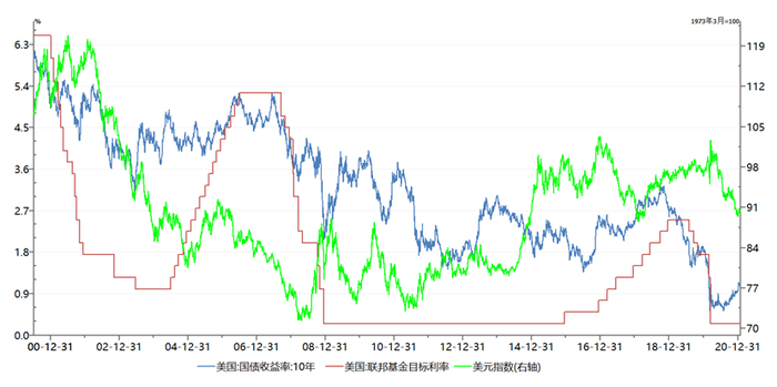 2021年,我们依然认为联储货币政策相对稳定,财政政策更加积极:2020年,美联储采取超宽松的货币政策救金融和商品市场,救经济,3月份连续两次紧急降息累积150BP,将联邦基金目标利率降至0-0.25%的超低水平,并采取了无限量宽松政策,资产负债表规模从疫情前的4.2万亿迅速升至最高时的7.2万亿,涨幅达到80%,此外,还采取了隔夜回购和流动性互换等非常规的货币工具,在9月份更是调整了货币政策框架,提出平均通胀目标。可以说美联储的货币政策基本已经达到应有的货币政策目标,美联储官员亦是在不同的媒体或者渠道均表达出当前货币政策适宜的论调,我们认为美联储暂时没有进一步宽松的必要,2021年,美联储将会维持当前的超低利率不变,2022年则会视经济复苏情况进行调整,同时美联储将继续将2%的平均通货膨胀率作为长期通胀目标,2021年则会细化平均通胀率货币政策。财政政策方面,美国政府四轮3万亿的财政刺激措施,已经在2020年7月底结束;二次疫情和三次疫情的爆发,第五轮财政刺激政策势在必行,本应该在下半年推出,但是因大选的政治考量,两党对于第五轮财政刺激规模和救助方向存在的分歧难以谈拢,从而导致第五轮财政刺激措施的难产,2020年12月,9000亿的财政刺激勉强通过,但是市场影响有限;随着拜登入主白宫和民主党控制国会两院,1.9万亿规模刺激措施再度提出,但是顺利通过的可能性依然较小。整体来看,2021年,美联储的货币政策会相对稳定,超低利率会保持不变,量化宽松规模则会相对稳定,而财政政策则会更加积极,新任财政部长耶伦将会推动财政政策进展,不排除出现2万亿以上的财政刺激规模。