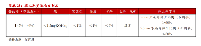 花生期货交易标的为油用花生仁。其实油用花生和食用花生没有严格的区分界线,各占比50%左右,其中食用花生品级相对更高,下游食品加工企业对花生原料需求个性化较强,而榨油企业对油用花生采购时采用质量指标标准化程度较高(主要以含油率、酸价等指标定价),油用花生在市场中的流通量相对更大一些,大宗商品属性也更强一些。因此郑商所设计的花生期货的标的为油用花生,以含油率为【45%,46%)、酸价≤1.5mgKOH/g、霉变粒≤1%等为基准品,并对可交割的替代品主要质量指标设置了升贴水,其中霉变粒的升贴水幅度采用扣量方式。