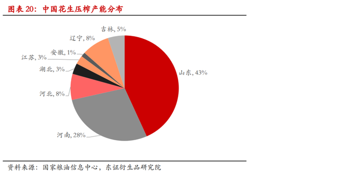 4、山东、河南、河北为花生榨油产能前三,分布占到全国总产能的43%、28%、8%,压榨规模集中度较高,大型企业定价权较强。