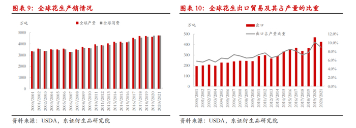 全球花生产量及消费量整体呈现缓慢上升的态势,近四年来产量在4700万吨左右水平,USDA预计20/21年度全球花生产量在4735.7万吨;全球花生消费近20年来的平均年增速不到2%,USDA预计20/21年度全球花生消费量4730.3万吨;全球花生进出口贸易量也呈现缓慢增加的态势,19/20年度全球花生贸易量有较大幅度的增加,贸易量创新高,全球出口量19/20年度突破400万吨,达到468.7万吨,占到全球产量的10%,因此全球花生贸易量并不大。