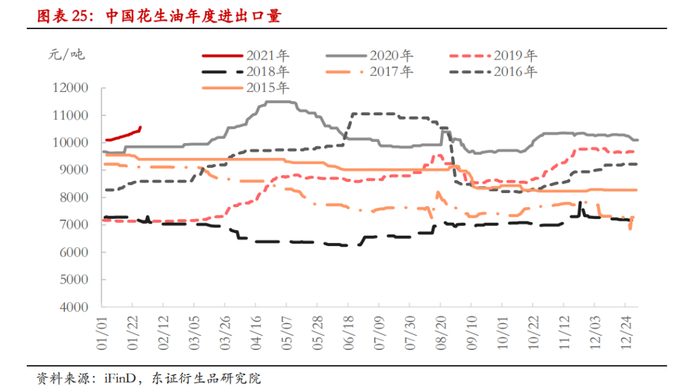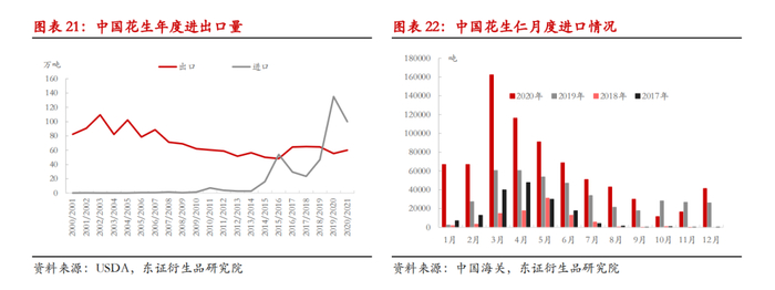 从进口的季节性看,国内进口主要集中在上半年,对国产花生季节性供应减少的时期给予补充。花生仁进口来自于非洲,基本12月开始装运,5-6月发船基本结束,船期50天,3-7月为进口到货高峰期。