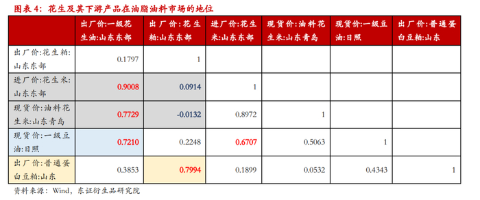 花生价格与其他油脂油料既有联系也有一定的独立性。花生的出油率较高,一般在40%-50%,因此和以豆粕作为主要产物的大豆不同,花生油作为花生的主要产品,贡献了花生压榨的核心利润来源,两者价格关联较强。我们将山东花生米、花生油、花生粕、豆油、豆粕价格走势分别做了对比,发现花生米价格与花生油、豆油价格的相关性较高,而与花生粕价格相关性较小。