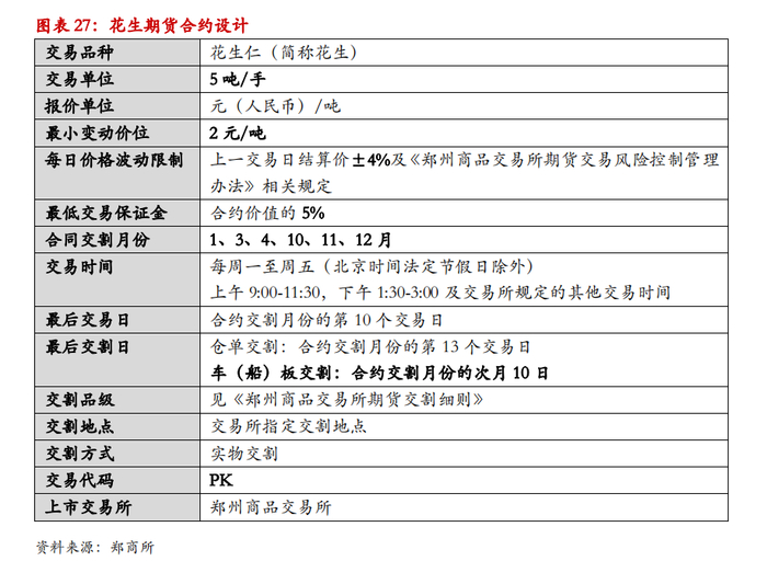 值得注意的是,和其他农产品不同,根据花生的生产消费特点,交易所设置了10、11、12、1、3、4月合约,而没有设置5-9月的合约。因花生在10月大量上市后,至次年4月为贸易流通最活跃的时间段。进入5月后,随着气温的回升及降雨的增多,花生储存难度增加,易发生霉变、酸价升高等问题,且进入5月后流通领域库存减少,下游企业大多于6月之前备足库存,此后花生原料的采购较少,而9月新花生刚开始上市,量还很少,水分也高。为了保证可供交割品的充足,避免交割风险,交易所没有设置5-9月的合约。