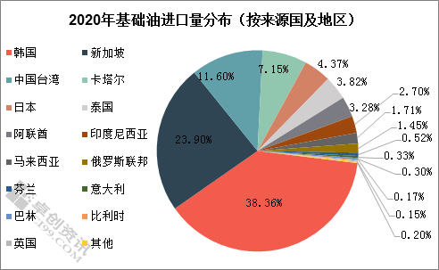 从来源国及地区来看,2020年,韩国、新加坡、台湾省仍位列进口前三位。其中,自韩国进口基础油96.71万吨,占全国基础油进口的38.36%,位列第一位;自新加坡进口基础油60.25万吨,占比23.90%,位列第二位;自台湾省进口基础油29.25万吨,占比11.60%,位列第三位。