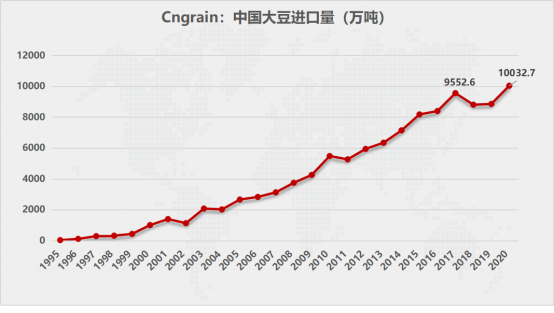 首先看饲料粮的主要原料之一——大豆。我国对大豆的进口依存度相当高,连续8年超过80%。统计数据显示,2019年,我国大豆产量1810万吨,较上年增长近13.34%。2019年我国大豆进口量实现8851万吨,进口量已在产量的4倍以上!2020年大豆进口更是首次突破一亿吨,全年累计进口大豆10032.82万吨,同比增幅11.7%。而且从长远看,我国大豆进口数量仍将会维持在较高水平。