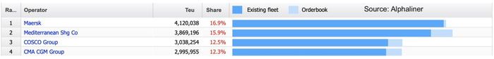 MSC订单交付时,MSC的运营能力将超过马士基,但按TEU的实际拥有吨位计算,丹麦航空公司仍然非常占主导地位,目前拥有的集装箱船队数量是日内瓦集装箱船的两倍多。